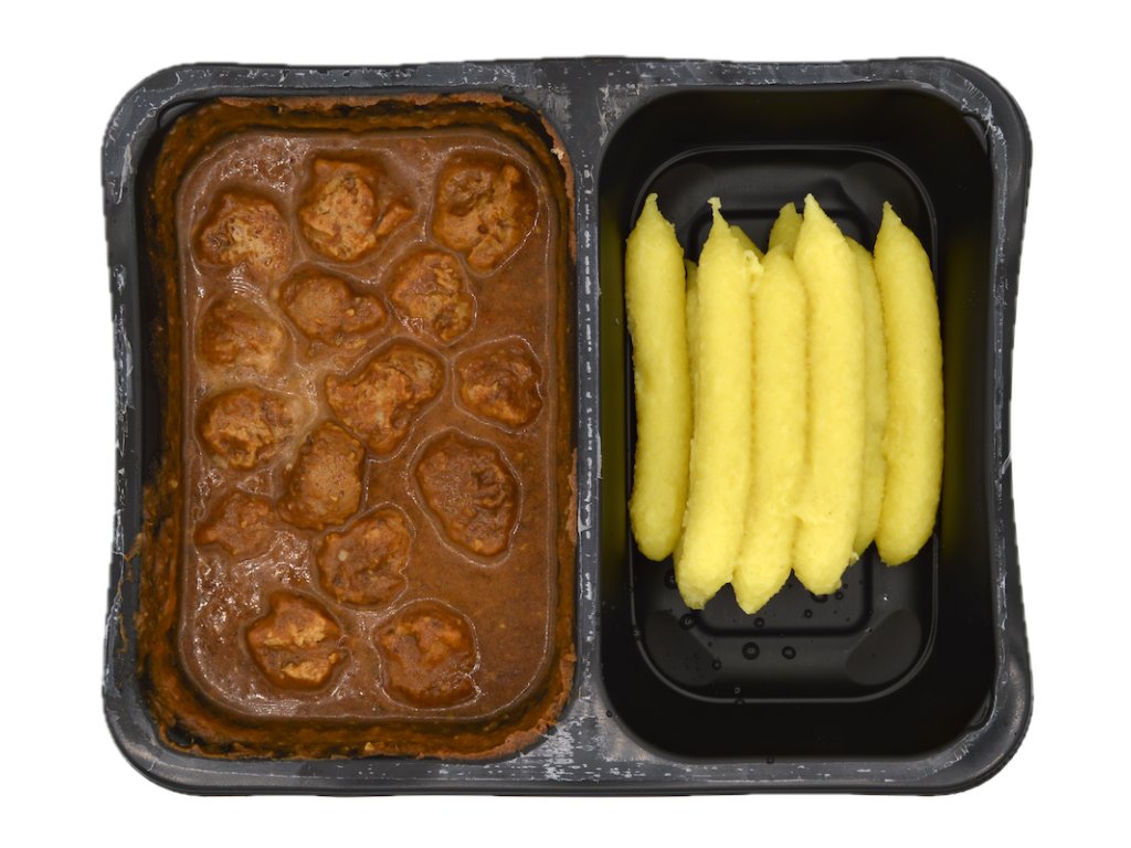S bramborovými šulánky a kousky na bázi rostlinné bílkoviny, obohacené vitamíny B12. 1 porce 390g.